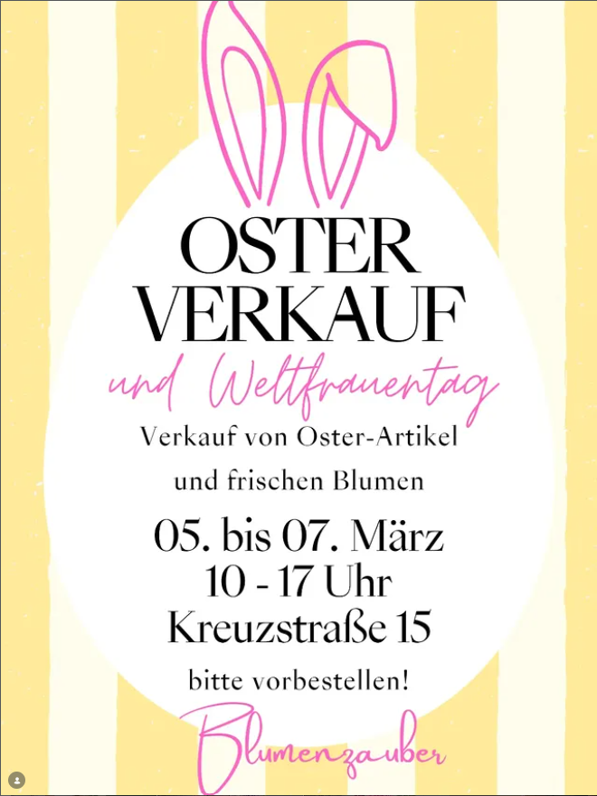 Vom 5.–7. MĂ€rz erwartet euch bei Blumenzauber eine schöne Auswahl an Osterdeko und frischen Blumen – perfekt, um den FrĂŒhling ins Zuhause zu holen oder eine kleine Aufmerksamkeit zum Weltfrauentag zu verschenken.