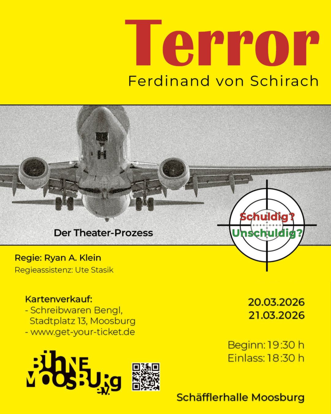Dieses Wochenende habt ihr zum letzten Mal die Möglichkeit, das packende Gerichtsdrama „Terror“ von Ferdinand von Schirach zu erleben – präsentiert von der Bühne Moosburg in der Schäfflerhalle.